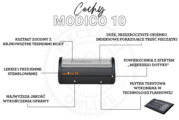 Pieczątka Modico 10 to jeden z największych modeli w ofercie marki Modico, wykorzystujący nowoczesną technologię flashową (błyskową). Dzięki dużej powierzchni odbicia jest idealnym rozwiązaniem dla firm potrzebujących umieścić na stemplu rozbudowane dane, tabele, grafiki lub logotypy.