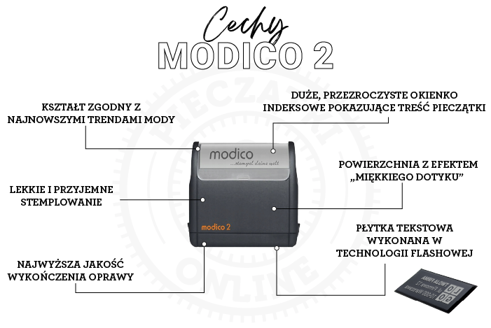 Modico 2 to niewielka, ale niezwykle precyzyjna pieczątka, która świetnie sprawdzi się w codziennym użytkowaniu. Dzięki technologii flash, odbicie jest wyraziste, trwałe i estetyczne. To doskonały wybór dla osób, które potrzebują pieczątki z krótkim tekstem lub prostym logotypem.
