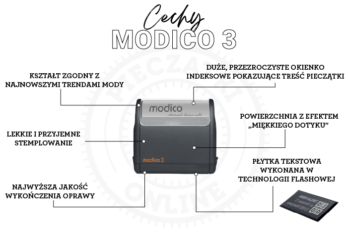 Modico 3 to uniwersalny model, który pomieści więcej treści niż mniejsze pieczątki, jednocześnie zapewniając profesjonalne odbicia. Świetnie nadaje się do danych firmowych, adresów czy numerów kontaktowych.