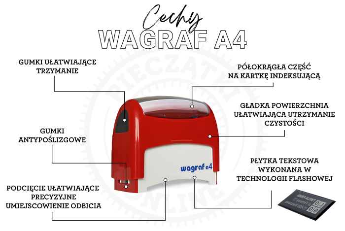 Pieczątka Wagraf A4 to nie tylko wygoda użytkowania, ale również innowacyjna procedura wykonania. Automat produkowany jest w oparciu o nowoczesną technologię flashową (nazywaną również błyskową czy Pre-ink). Pozwala ona na niezwykle precyzyjne wykonanie gumek, a tym samym odbić. Jest to idealne rozwiązanie dla firm posiadających szczegółowe logo lub dużo danych, które muszą odbijać się perfekcyjnie.